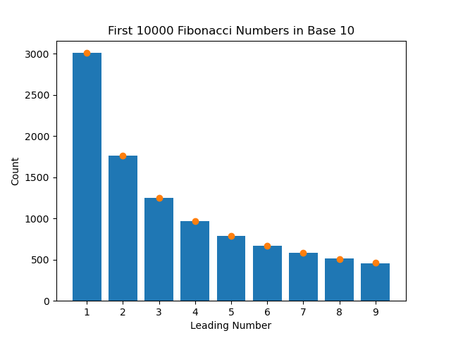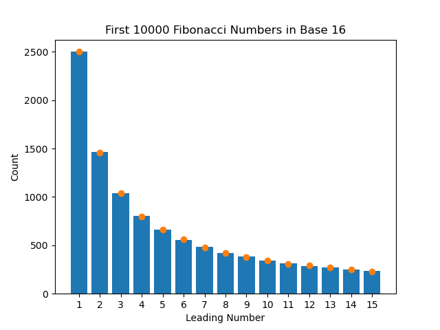 There is one final thing I wanted to test. Theoretically, this invariance would also apply if we changed what base we used to calculate the salaries from base 10 to base 16 (or any base). I wasn't entirely sure if it would work, so I decided to pick a different dataset that more closely followed Benford's Law in base 10 so that it would be obvious whether or not it worked in base 16. It turns out that the numbers in the Fibonacci Sequence follow the law very closely. They also span many orders of magnitude, making them great for this test. I ran the test two more times; once with the first 10000 numbers of the Fibonacci Sequence in base 10, and then the same numbers in base 16.