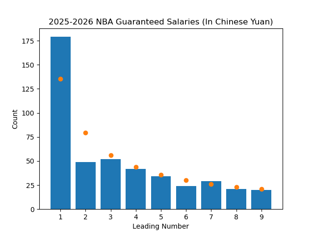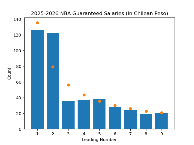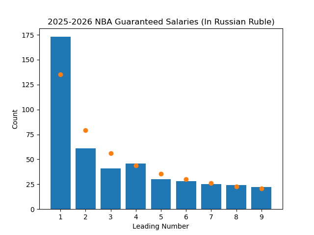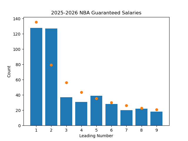 Even with all of this proof, this concept felt off to me, so I figured I should test it. There's a great interactive website here that lets you visualize many datasets to see if Benford's Law applies to them, but I wanted to test it myself. The first step was to find a dataset that I thought Benford's Law would apply to. I was recently looking at the salary of NBA players after the Bucks horrendously overpaid Myles Turner, so the NBA salaries dataset was right there for me to use (Thank you basketball-reference). I grabbed every player's current guaranteed salary, and wrote a quick python program to go through the data and plot it. Here is the result, along with points on the graph showing what the expected value should be if it exactly followed the law.