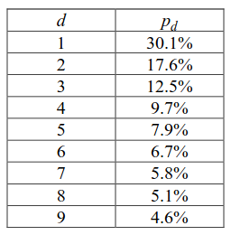 It is surprisingly simple. The probability of digit “d” being the leading digit is given by the formula. The calculated probabilities are listed below